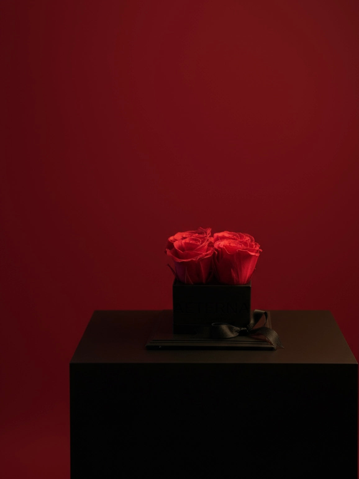 Elegante caja de cartón negra con listón a juego y capelo de acrílico, que protege 4 rosas naturales preservadas en un vibrante rojo , conservando su textura y delicado aroma por años. Un regalo sofisticado y atemporal que transmite lujo y distinción. Medidas: 16x16x16 cm.