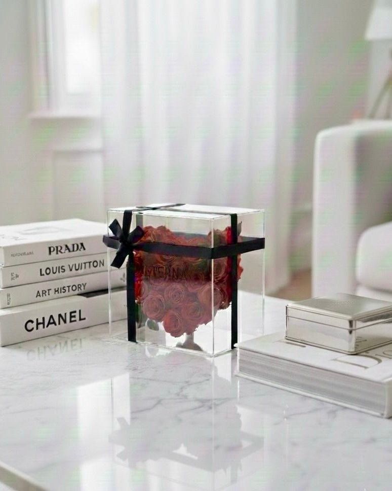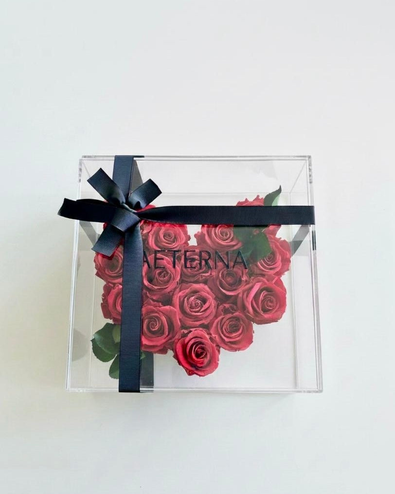 Elegant acrylic box with 15 preserved natural roses arranged in a heart shape, maintaining their beauty and exquisite aroma for years — a romantic and sophisticated detail.