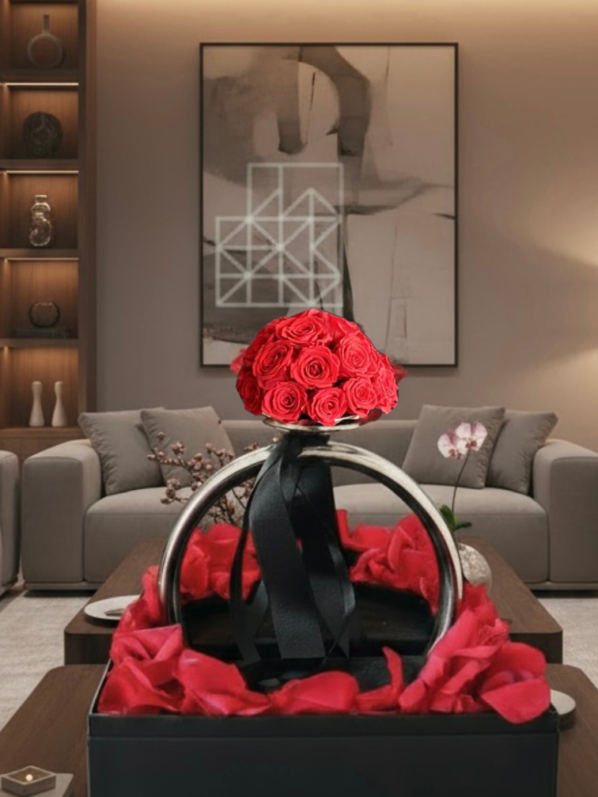 Presenta 22 rosas preservadas mini en una argolla XL de 28 cm, dentro de una caja de lujo cubierta de pétalos preservados con un aroma exquisito a rosa. Medidas: 33 x 43 x 21 cm.